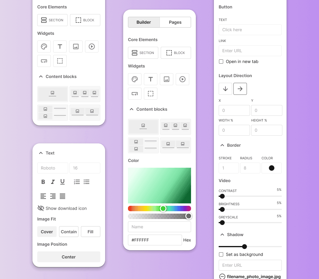 To support a drag and drop creator I designed a side panel experience to give users access to frequently used page widgets (I.e. typography, images, video, colour palettes, sections, templates, icons, brand guidelines) and properties for control and customisation capability of each widget. In return, making it easy for their respective internal teams and external partners to help themselves to logos, fonts and templates whilst keeping control of compliance.